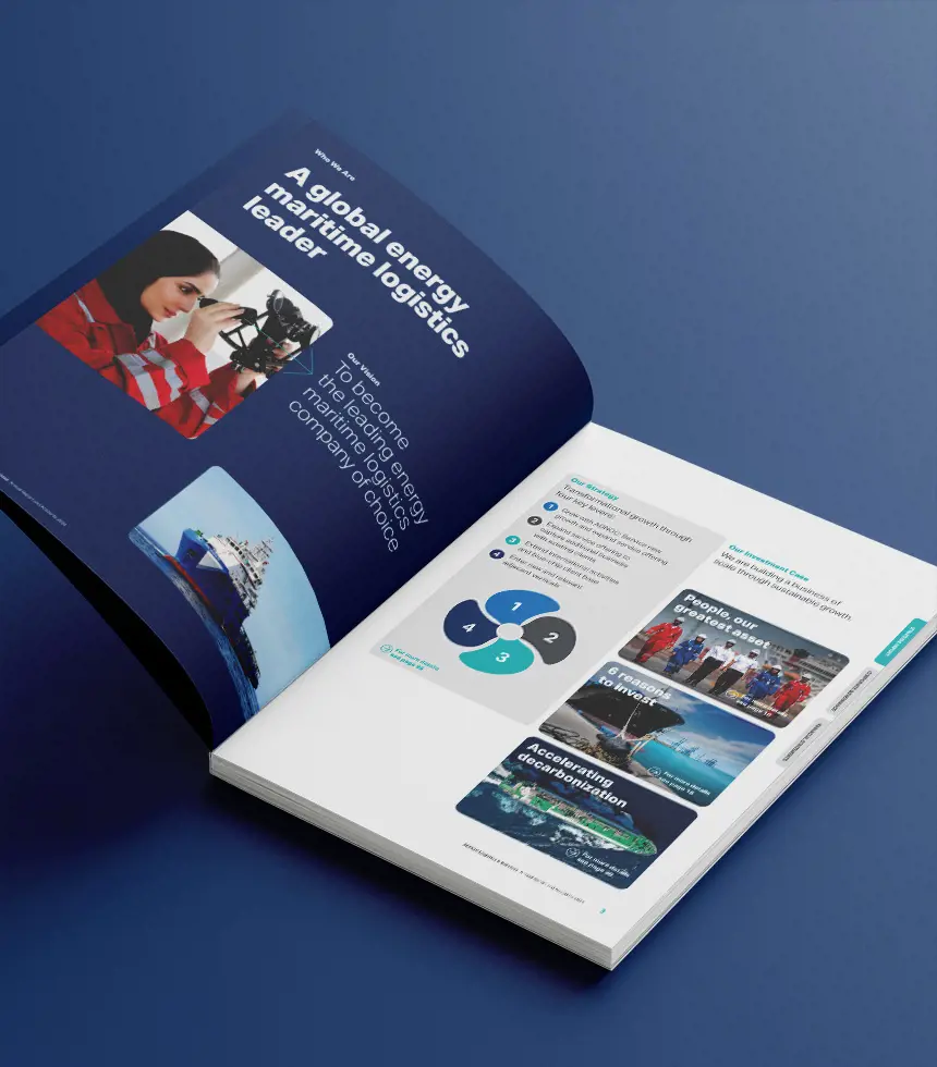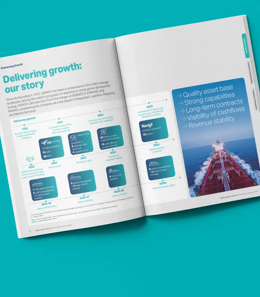 The 2024 Annual Report showcases ADNOC L&S’s evolution as a strategic enabler of the UAE’s energy sector and a leader in maritime logistics. Our role was to capture this ambition in a report that was brand-led, stakeholder-focused and seamlessly integrated with sustainability. Anchored in the theme Delivering Energy for Life, the report combined strategic clarity with authentic storytelling. Every section connected performance and purpose, brought to life through powerful photography of vessels, operations and people - reflecting both capability and culture. The investment case was structured as a story, centred on people, decarbonisation and reasons to invest, blending commercial and ESG strengths into a future-focused proposition.