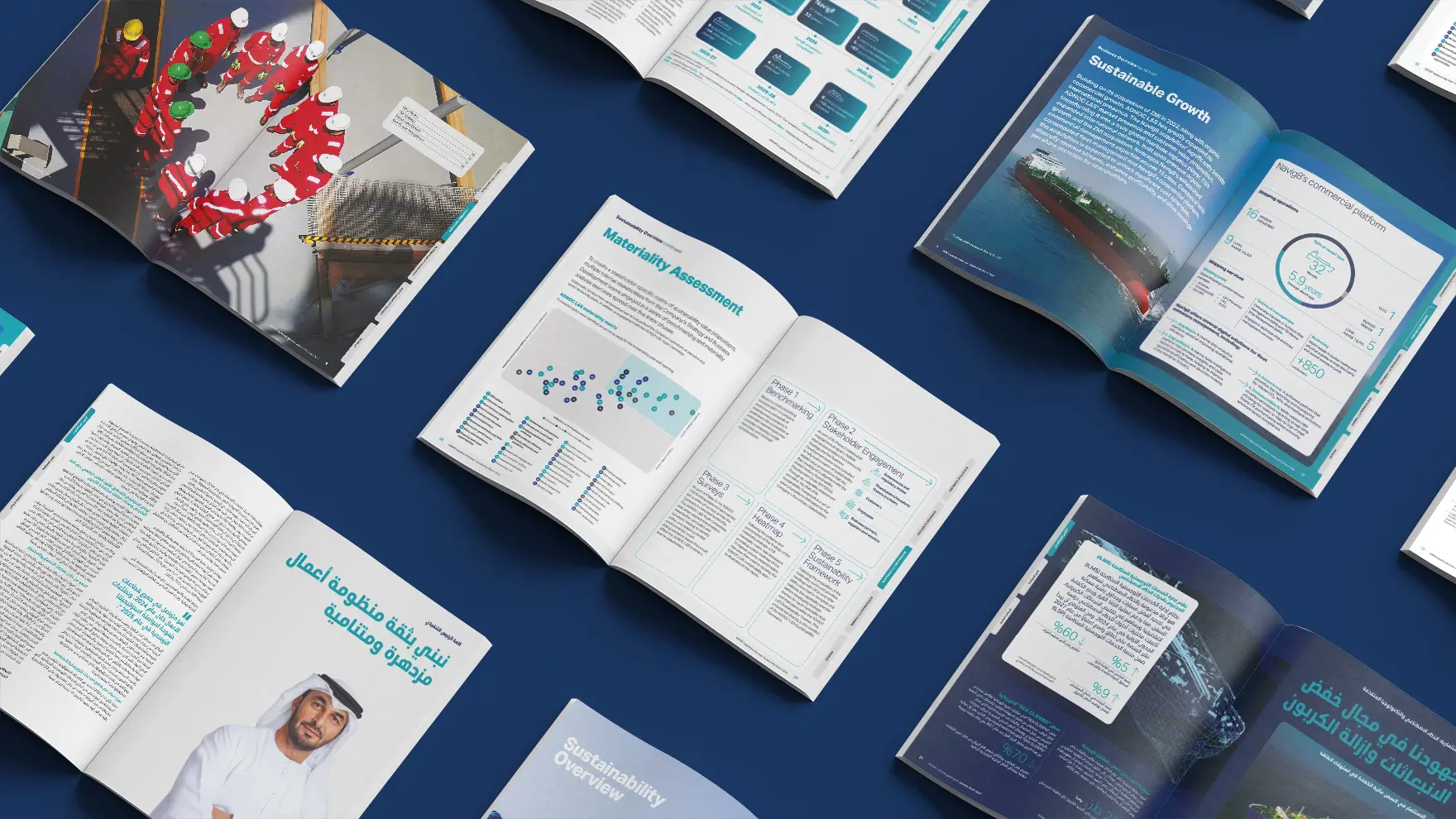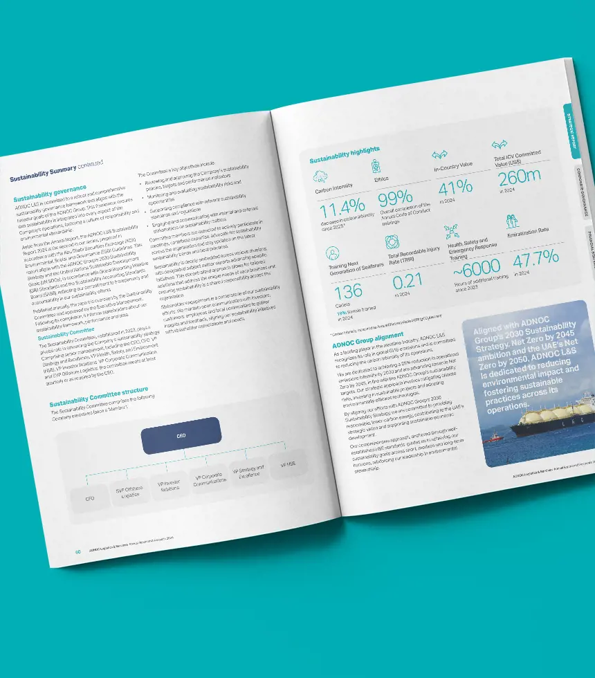 Alongside a premium print format, we designed a clean, intuitive layout with strong navigation and visual impact. Progress was made tangible through case studies, while a best-practice sustainability dashboard gave stakeholders a concise, at-a-glance view of commitments, SDG alignment and performance. The result is a confident, high-quality report that strengthens ADNOC L&S’s reputation as a trusted partner in the energy value chain, reinforcing its role in driving growth, innovation and sustainability across the maritime sector.