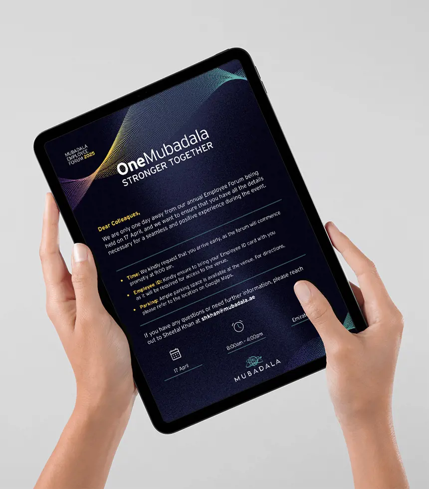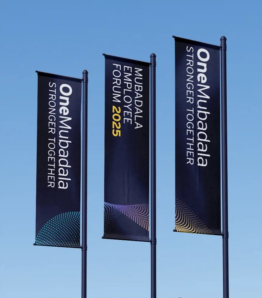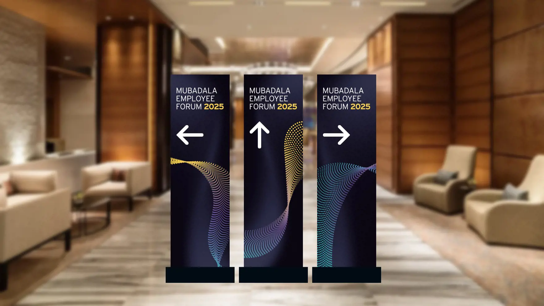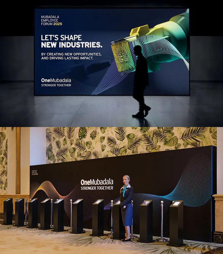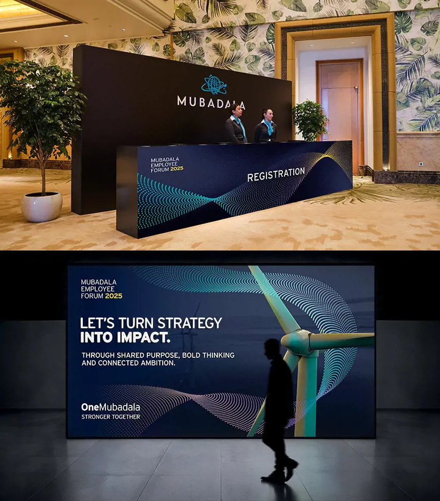 For the 2025 edition of the Employee Forum, Mubadala brought together employees from four different organisations under the umbrella of One Mubadala. We were tasked with developing a creative theme that would feel inclusive and familiar to the attendees. To achieve this, we employed a limited colour palette drawn from each of the entities, we also used colour treated photography to minimise the number of colours in each application and ensure the palette felt coherent and ownable. This, in addition to a key graphic comprising multiple small dots to create larger, dynamic shapes, further emphasised the unifying message underlined by our theme, “Stronger Together” - multiple individuals or entities working as one. These key graphics also featured organic yet futuristic fluid wave forms that created a sense of energy, motion and future-focused momentum.
