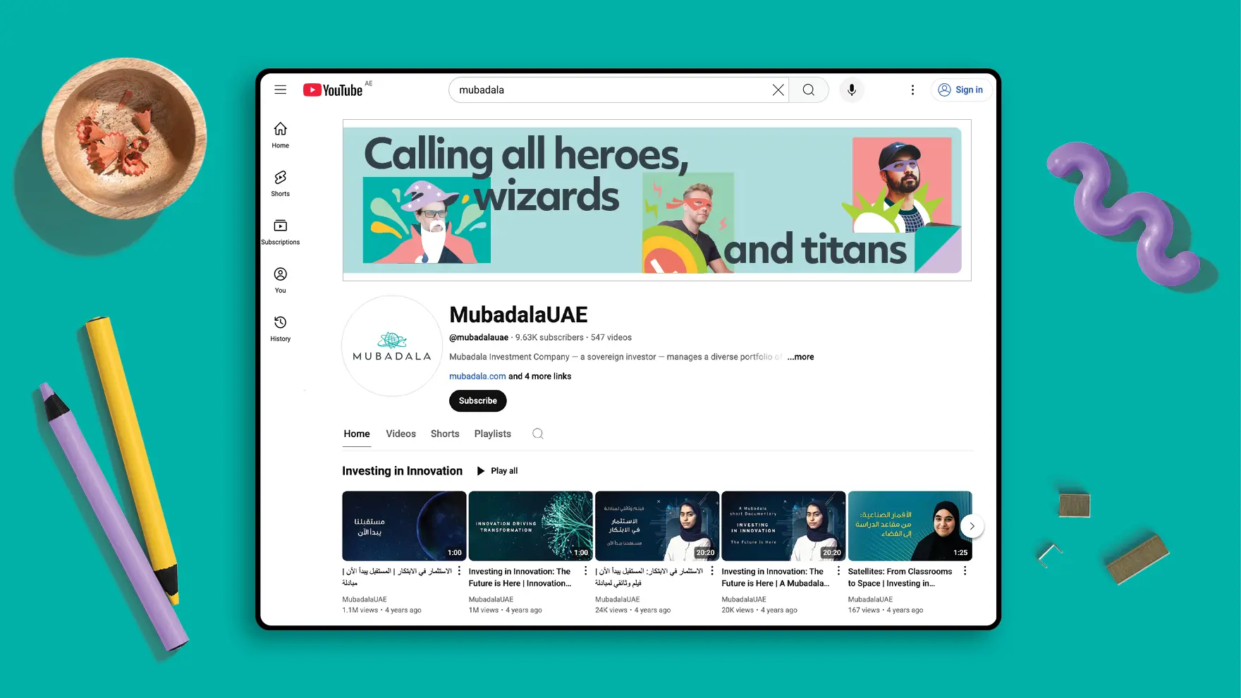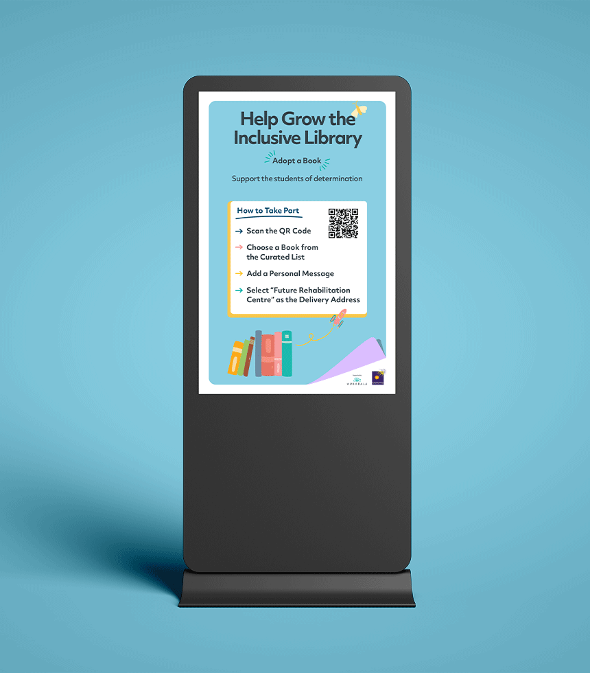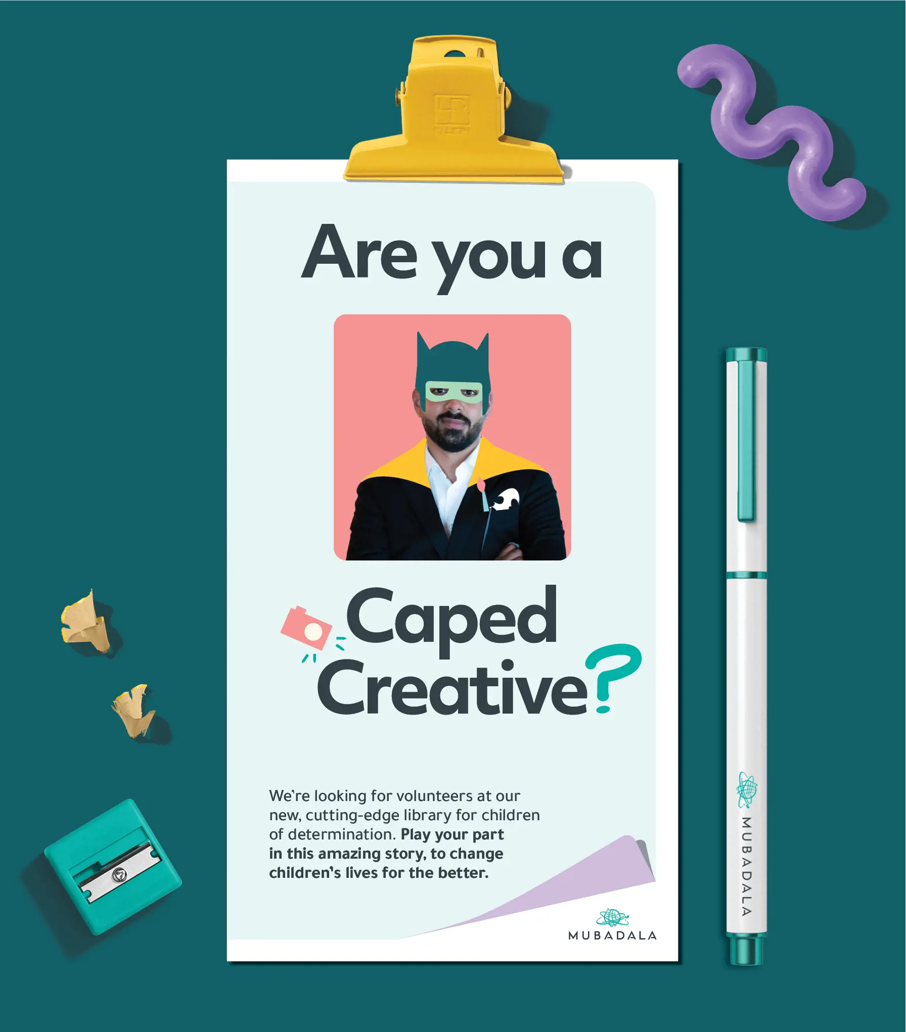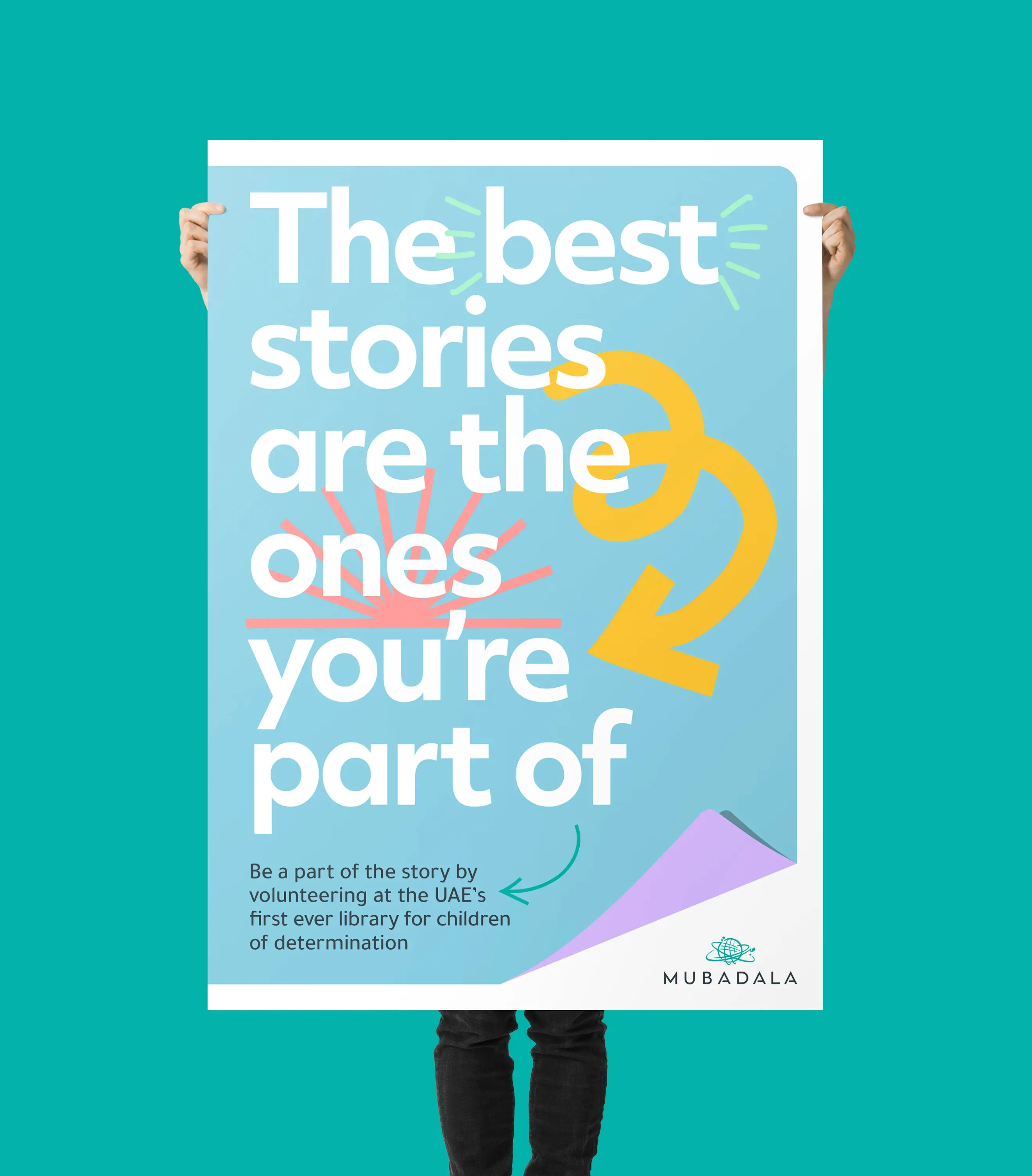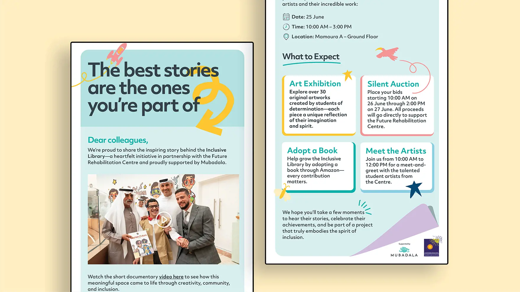 We were tasked by Mubadala to bring to life the Inclusive Library—a vibrant new space at the Future Rehabilitation Centre in Abu Dhabi designed for children and young adults with learning difficulties. Our role was to create a fun, engaging campaign that not only showcased Mubadala’s community support but also invited employees to get involved—through book donations, recording audiobooks, or volunteering time. The campaign’s creative direction centred on a soft pastel palette adapted from Mubadala’s colours, combined with a playful, hand-drawn style. Importantly, the children were involved at every step, with the opportunity to contribute their own doodles and drawings, ensuring they felt ownership over their new space.