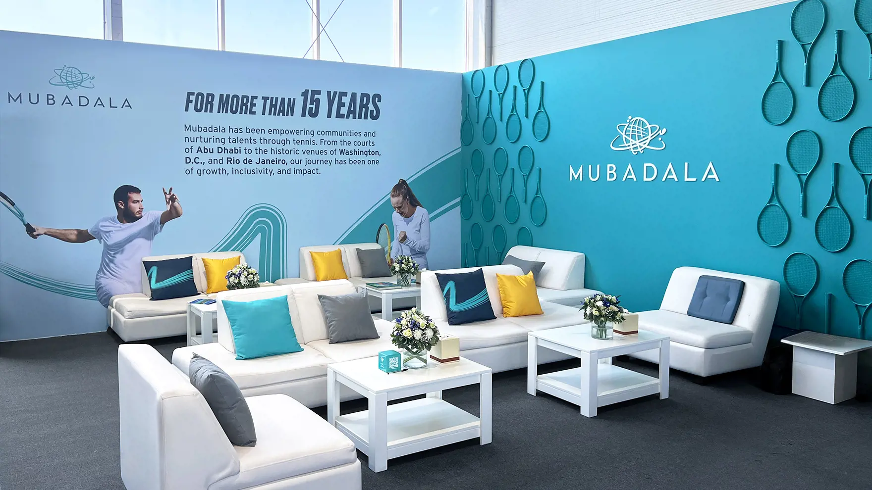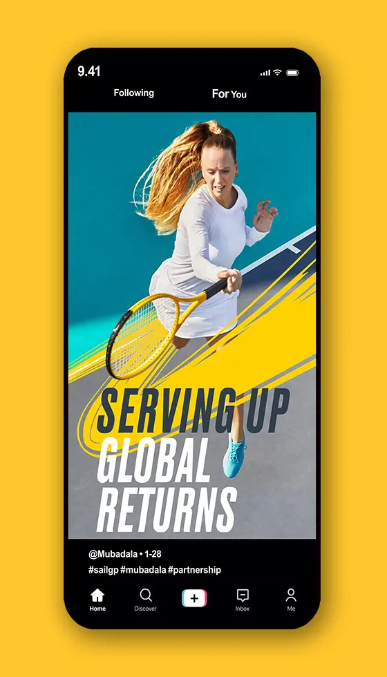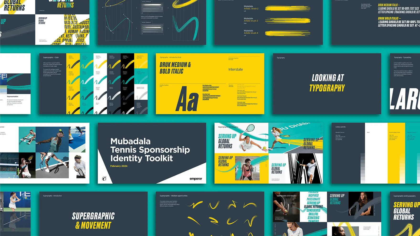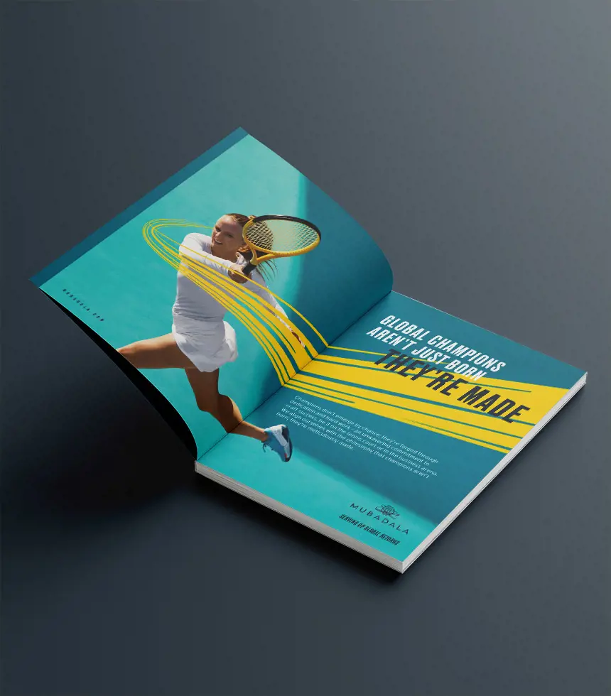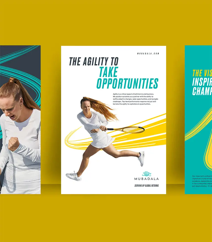 This project saw us bring ‘Serving Up Global Returns’ to life through a bold and distinctive campaign identity. At its core was the swoosh motif, symbolising both the dynamic energy of tennis and Mubadala’s role in forging connections. We paired this with energetic typography, an amplified colour palette and bespoke imagery, building a flexible yet ownable visual language that carried seamlessly across campaign assets. The approach ensured that the campaign felt both premium and powerful, meeting high expectations while standing apart in a crowded sporting and corporate landscape.